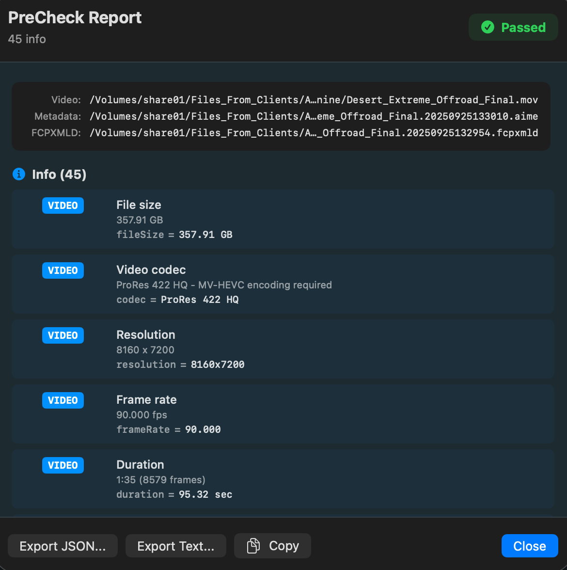 Before starting any encode, users can run Source PreCheck, a pre-flight validation tool that analyzes video, audio, metadata, and timeline files for potential issues without beginning the creation process. PreCheck grades results by severity: errors that block AIVU creation, warnings worth reviewing, and informational notes. Results are grouped by category (Video, Audio, Metadata, Compatibility). Source PreCheck is available without a license.