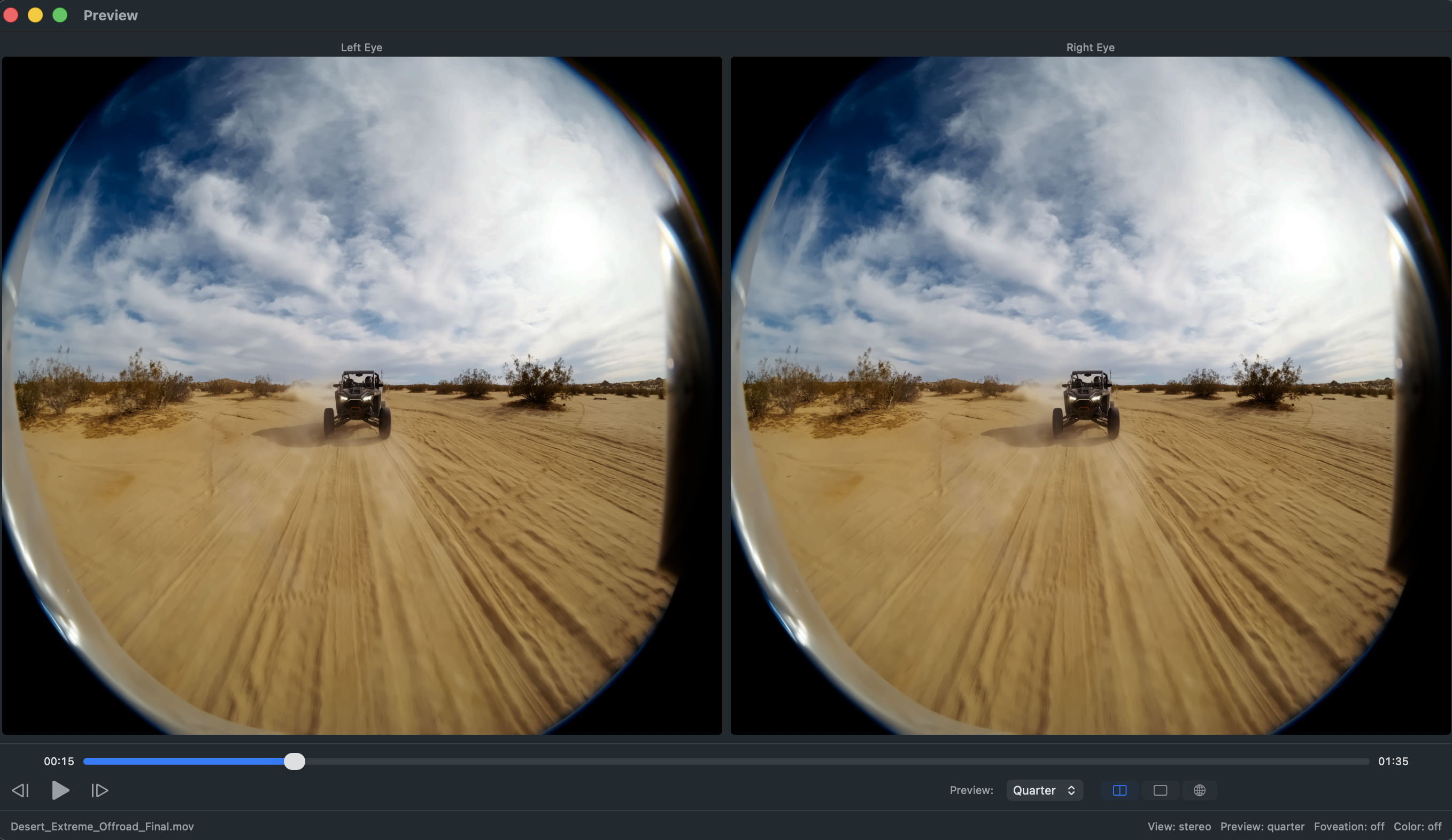 A built-in preview window provides real-time GPU-accelerated playback of the processed video. The preview is synchronized with the main window settings, so changes to foveation level, color space, or other parameters are reflected immediately. View modes include stereo (dual eye), single eye (left or right), and an immersive perspective view. Preview quality can be set to full, half, or quarter resolution.