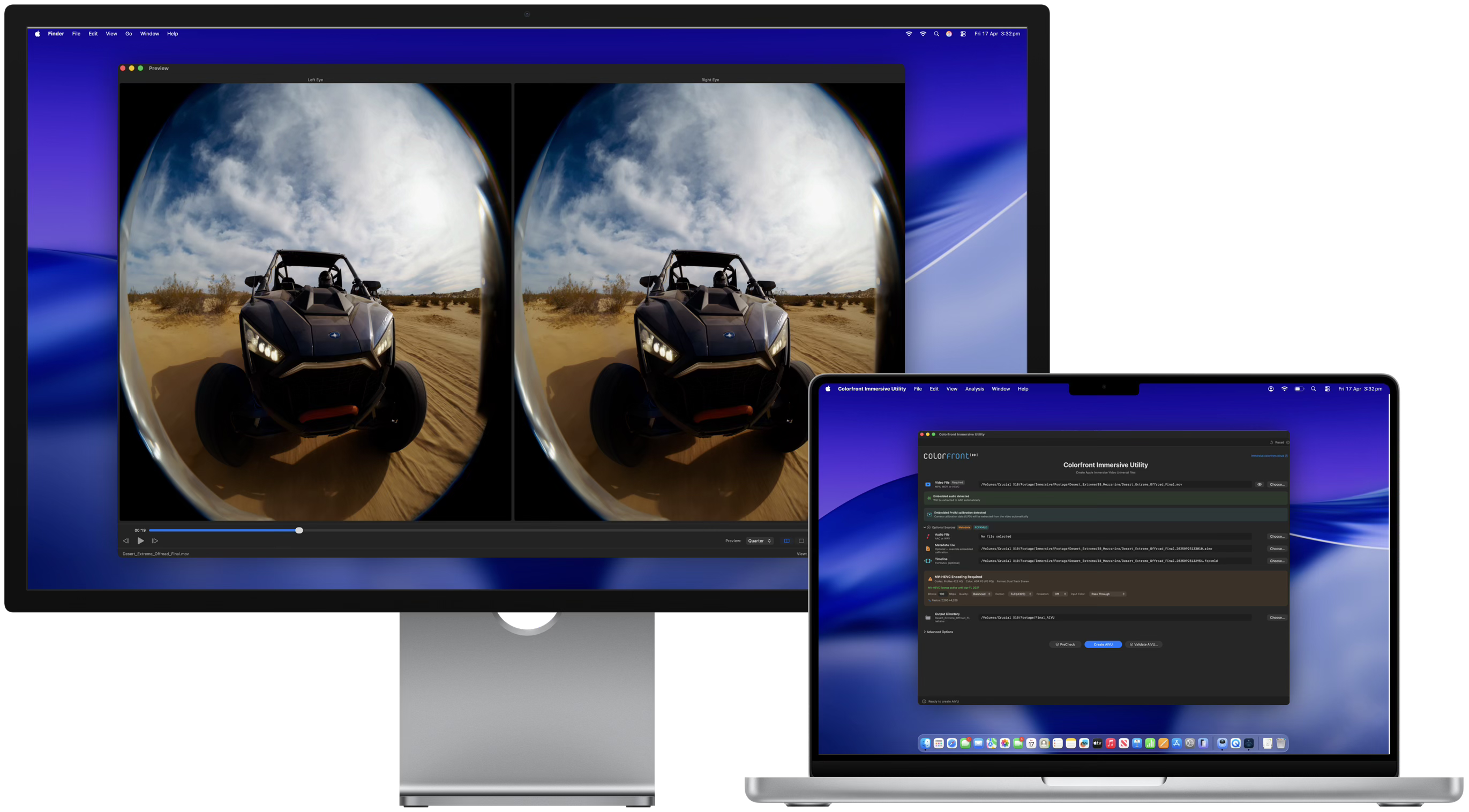 LOS ANGELES — April 18, 2026 — Colorfront today announced Colorfront Immersive Utility, a new macOS app that creates Apple Immersive Video files (.aivu) for playback on Apple Vision Pro. The app accepts video in ProRes, MV-HEVC, and other standard formats, pairs it with Spatial Audio and camera metadata, and outputs a single AIVU file ready for distribution.