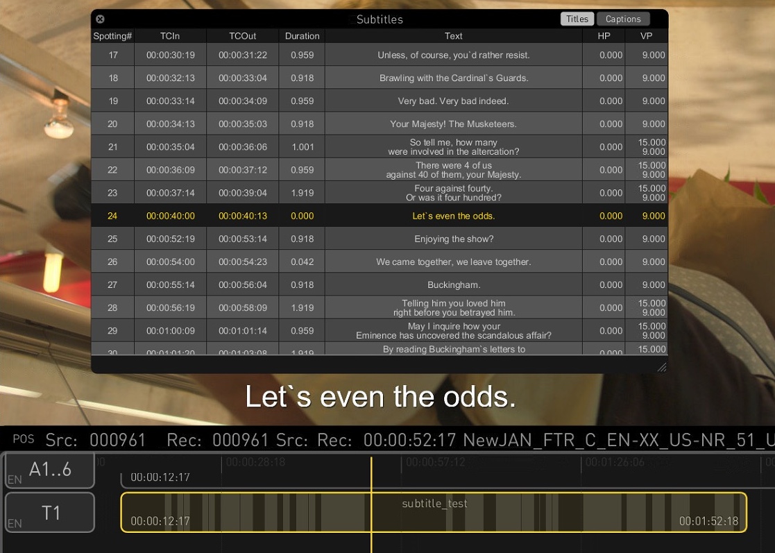 Subtitle Table functionality has been improved for better interactivity and workflow efficiency. The table now auto-scrolls and highlights the relevant row during timeline navigation, including scrubbing or stepping through frames. A new Titles/Captions toggle lets users switch between subtitle and caption views. Clicking subtitle durations in the timeline also highlights the matching row. Additionally, in/out timecodes can now be edited directly by double-clicking the relevant fields.