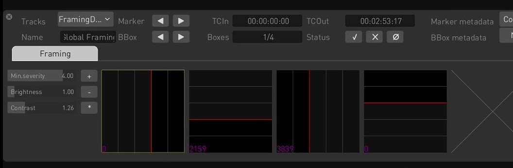 The new Marker Navigator window simplifies navigation across marker tracks in the timeline. Users can switch between tracks, browse markers and bounding boxes, and view timecodes. It includes status icons to accept or reject detections and a thumbnail panel for previewing issues. Sliders for minimum severity, brightness, and contrast allow fine-tuning of detection visibility, making QC review more efficient and precise.