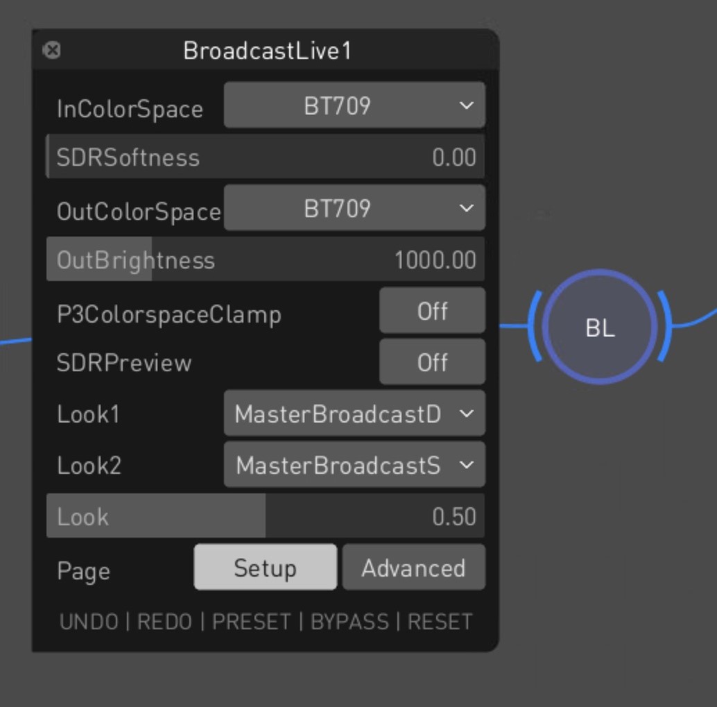The Broadcast Live tool extends the capabilities of Broadcast TV with support for scene-referred camera inputs and advanced tone mapping. For camera inputs, the tool features cinematic and broadcast look processing. It supports formats such as S-Log3, LogC, and C-Log.