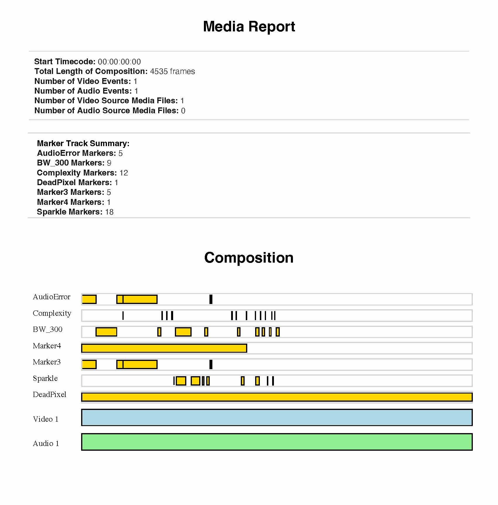 The Media Report PDF menu option provides an in-depth overview of the timeline’s content. The report includes basic metadata, a visual timeline overview, HDR analysis with Max FALL/CLL values and tolerance data, and dedicated QC summaries. It covers framing, audio errors, loudness, and other marker-based checks, offering a complete snapshot of media content and quality status.