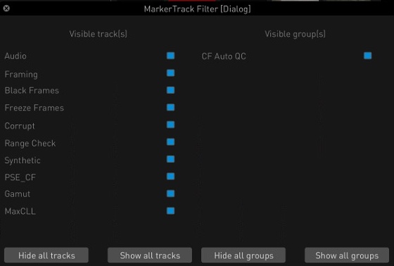 You can filter marker tracks directly from the timeline context menu. The filtering window lists all marker tracks, grouped as CF Auto QC (automatically generated) and External (manually imported). Users can toggle visibility for individual tracks or entire groups to focus on relevant markers. Quick action buttons let you show or hide all tracks or groups at once, streamlining timeline review and QC navigation.