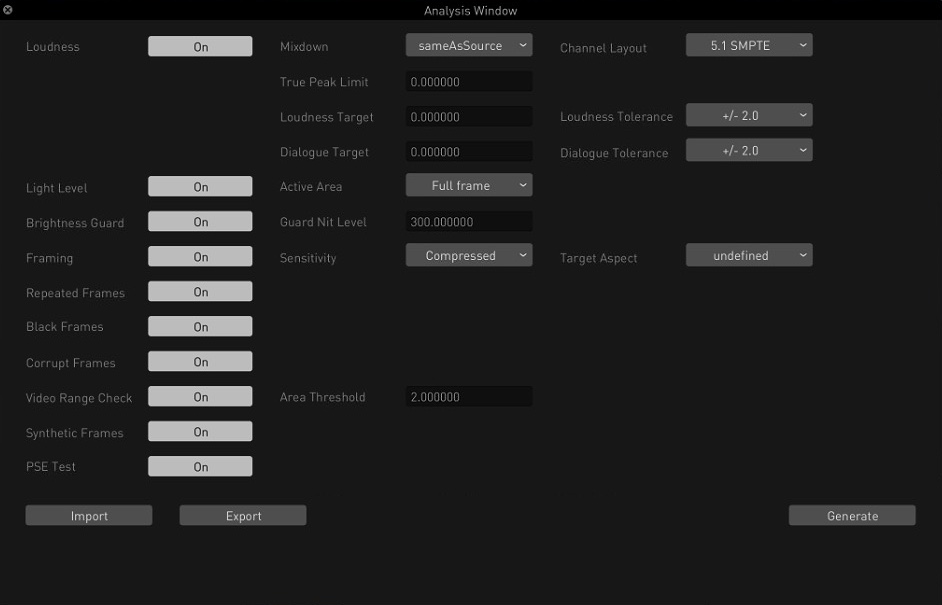 The QC Analysis Window, previously exclusive to the QC Player, enables users to configure and run automated quality control processes without navigating to the Render Page. Accessed via the File menu, it supports multiple encoders such as Loudness, Light Level, Brightness Guard, Framing, Repeated Frames, and Black Frames. Users can adjust audio mixdown and channel layout settings, customize encoder parameters, and perform detailed QC analysis more efficiently within the main interface.