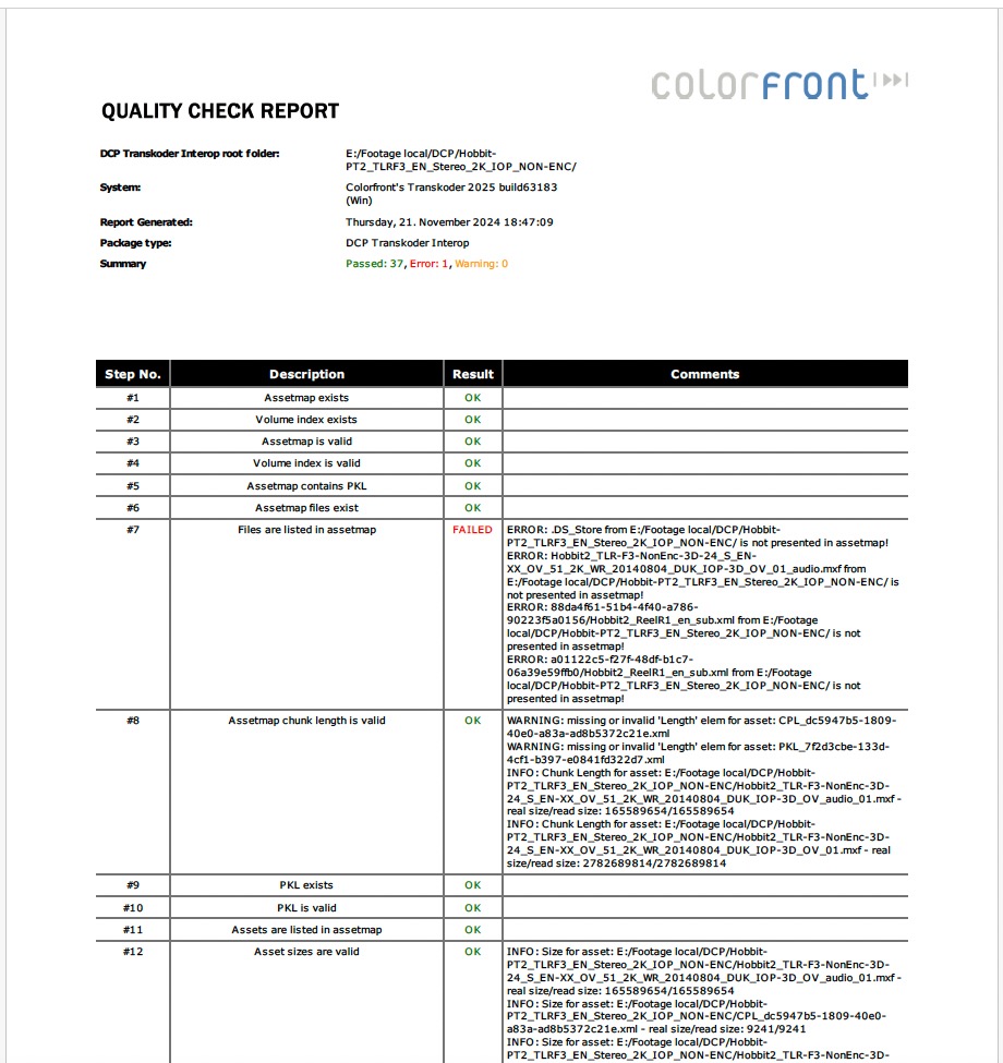 Transkoder now supports generating QC reports for DCP and IMF validation in PDF and HTML formats alongside the traditional TXT file. These reports summarize validation results, highlighting passed tests, warnings, and errors. They verify key components like Assetmap, PKL, CPL, and track files, and include detailed metadata for MXF content. The PDF and HTML versions present the data in a more readable, structured format, ideal for review and sharing.
