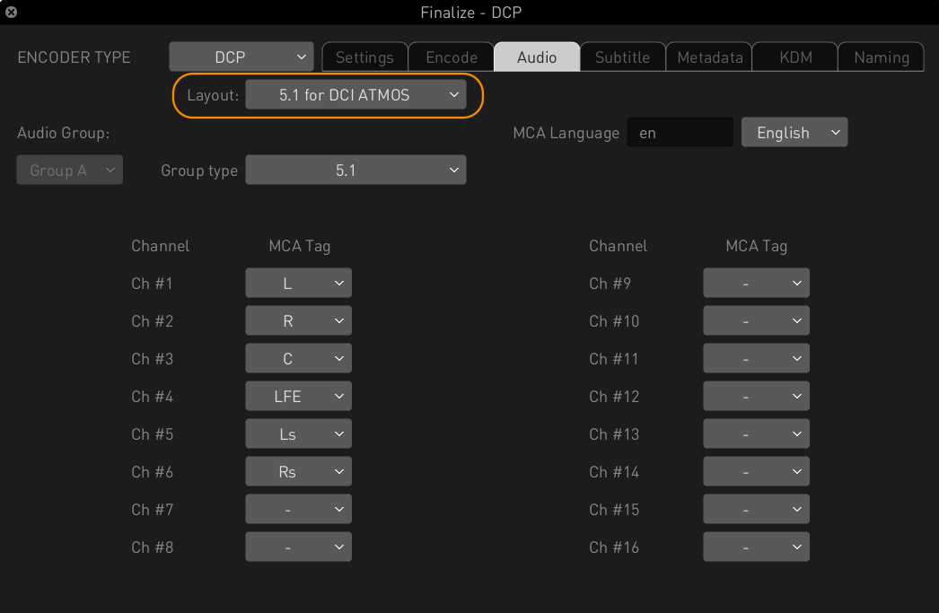 A new 5.1 for DCI ATMOS option is now available in the Layout dropdown of the Audio tab in the DCP Finalize Window. This configuration outputs a 16-channel audio file while muting channels above 6, allowing standard 5.1 mixes to be delivered within a DCI ATMOS-compatible layout. It ensures compliance with DCI specifications while simplifying audio delivery for cinemas that require an immersive-ready layout without full ATMOS content.