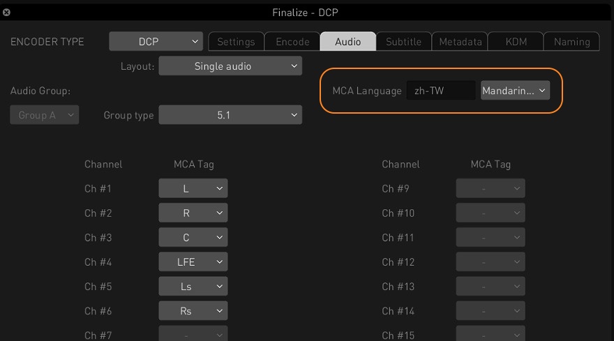 Transkoder now supports regional variations of the zh Chinese language flag in the Finalize Window, improving the accuracy of language metadata in IMF and DCP workflows. In the Audio tab, the MCA Language field updates automatically based on user selection. Supported options include key regional variants of Mandarin, such as zh-HK (Hong Kong), zh-CN (Mainland China), and zh-TW (Taiwan).